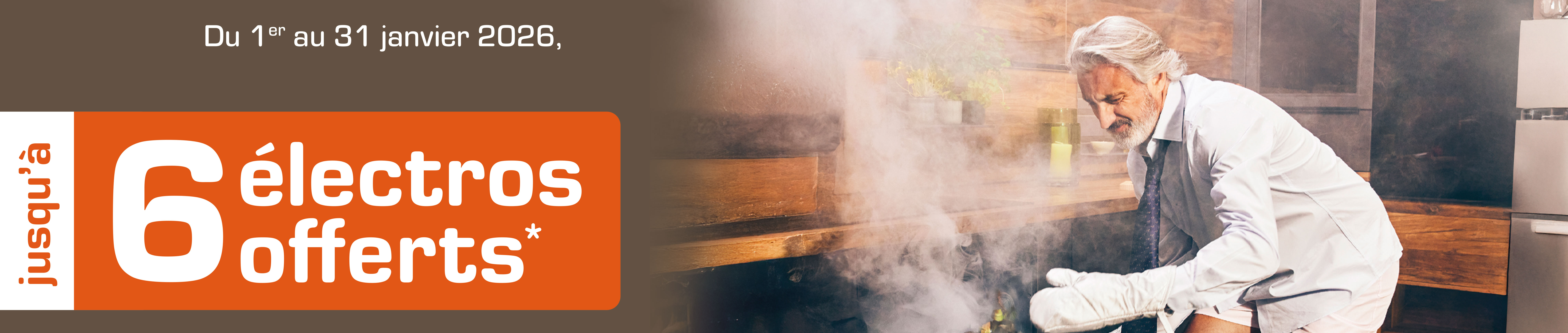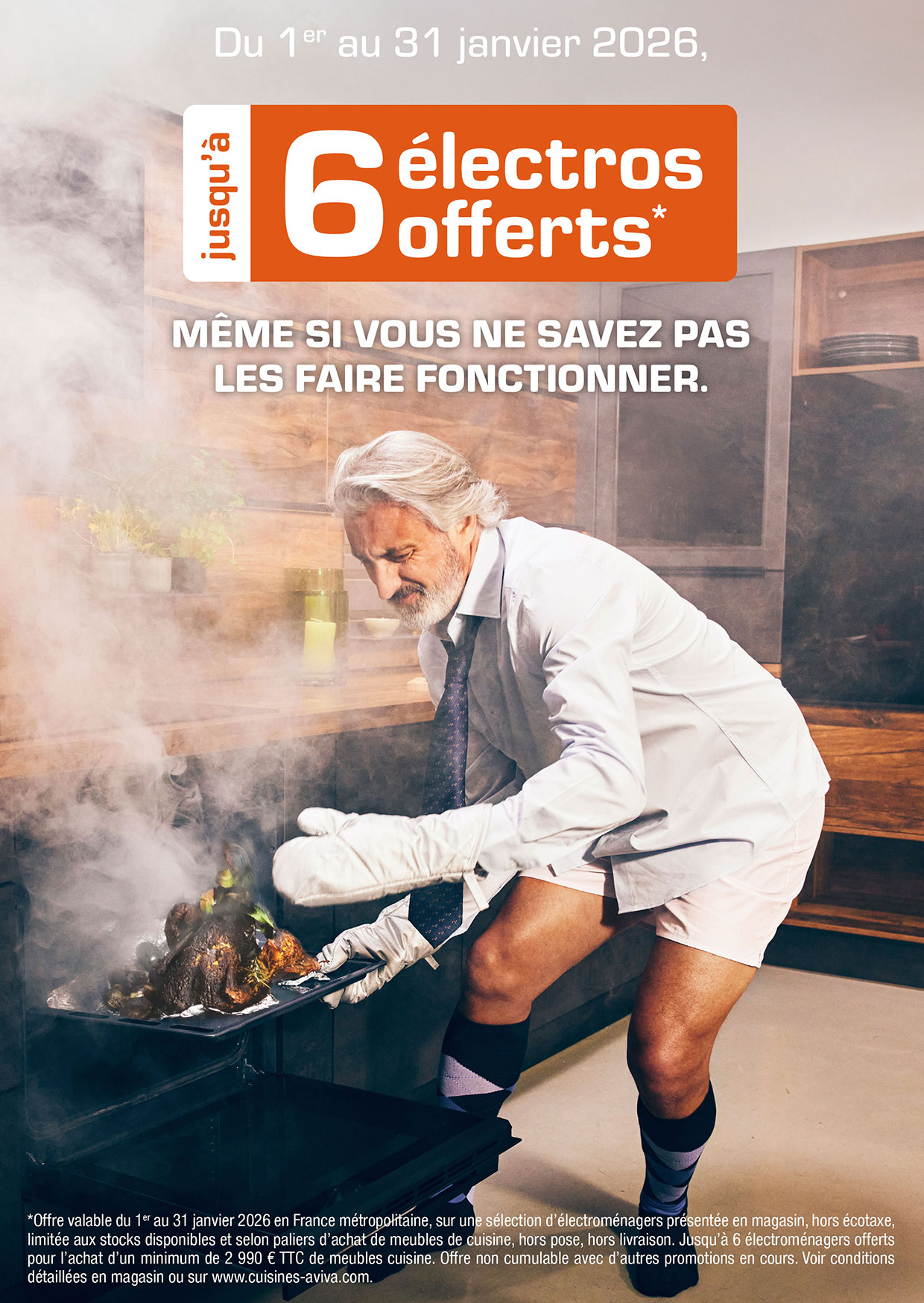 *Offre valable du 1er au 31 janvier 2026 en France métropolitaine, sur une sélection d’électroménagers présentée en magasin, hors écotaxe, limitée aux stocks disponibles et selon paliers d’achat de meubles de cuisine, hors pose, hors livraison. Jusqu’à 6 électroménagers offerts pour l’achat d’un minimum de 2 990 € TTC de meubles de cuisine. Offre non cumulable avec d’autres promotions en cours. Voir conditions détaillées en magasin ou sur www.cuisines-aviva.com
